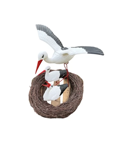 • Ensemble complet – la décoration comprend trois cigognes : une cigogne moyenne en vol, une cigogne claquante et une petite cigogne, créant une composition harmonieuse.
